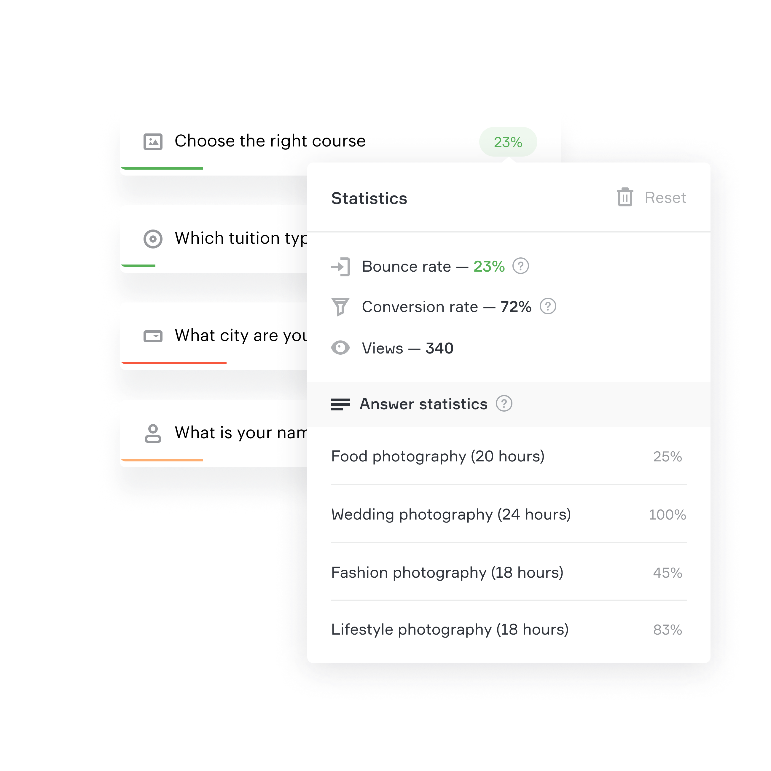 Anda dapat melihat tingkat pentalan untuk setiap pertanyaan dan persentase pilihan untuk semua opsi jawaban. Ini membantu mengidentifikasi pertanyaan yang menyebabkan tingkat pentalan tertinggi.
